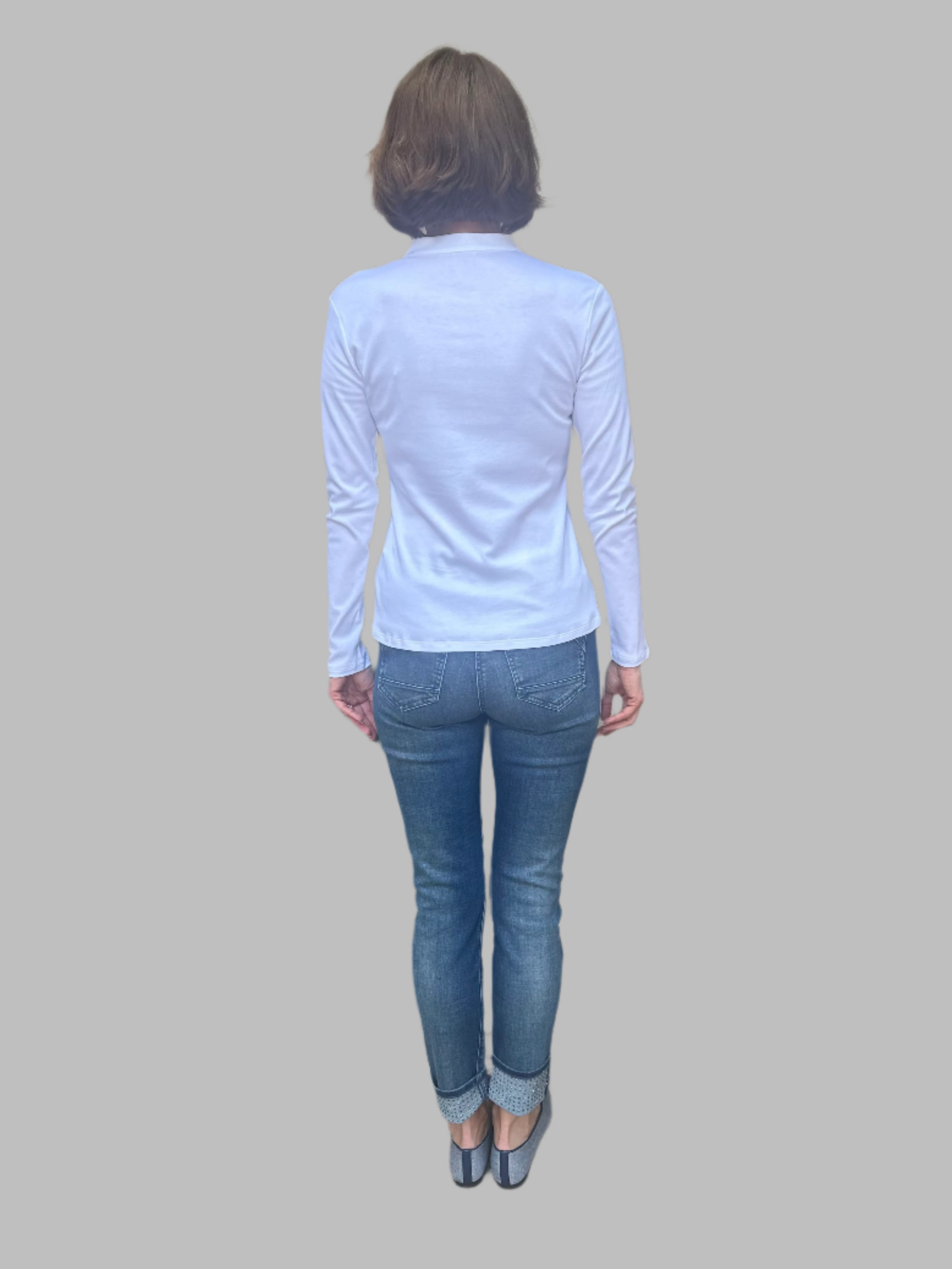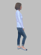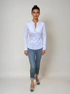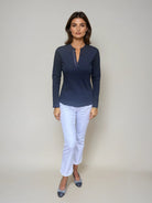 This polished top is all about understated elegance with a hint of sparkle. The minimalist silhouette is elevated by a deep V-notch neckline, trimmed with metallic fabric and delicate beading for a subtle touch of shimmer. It’s an easy yet refined piece that transitions effortlessly from day to evening.