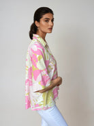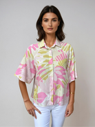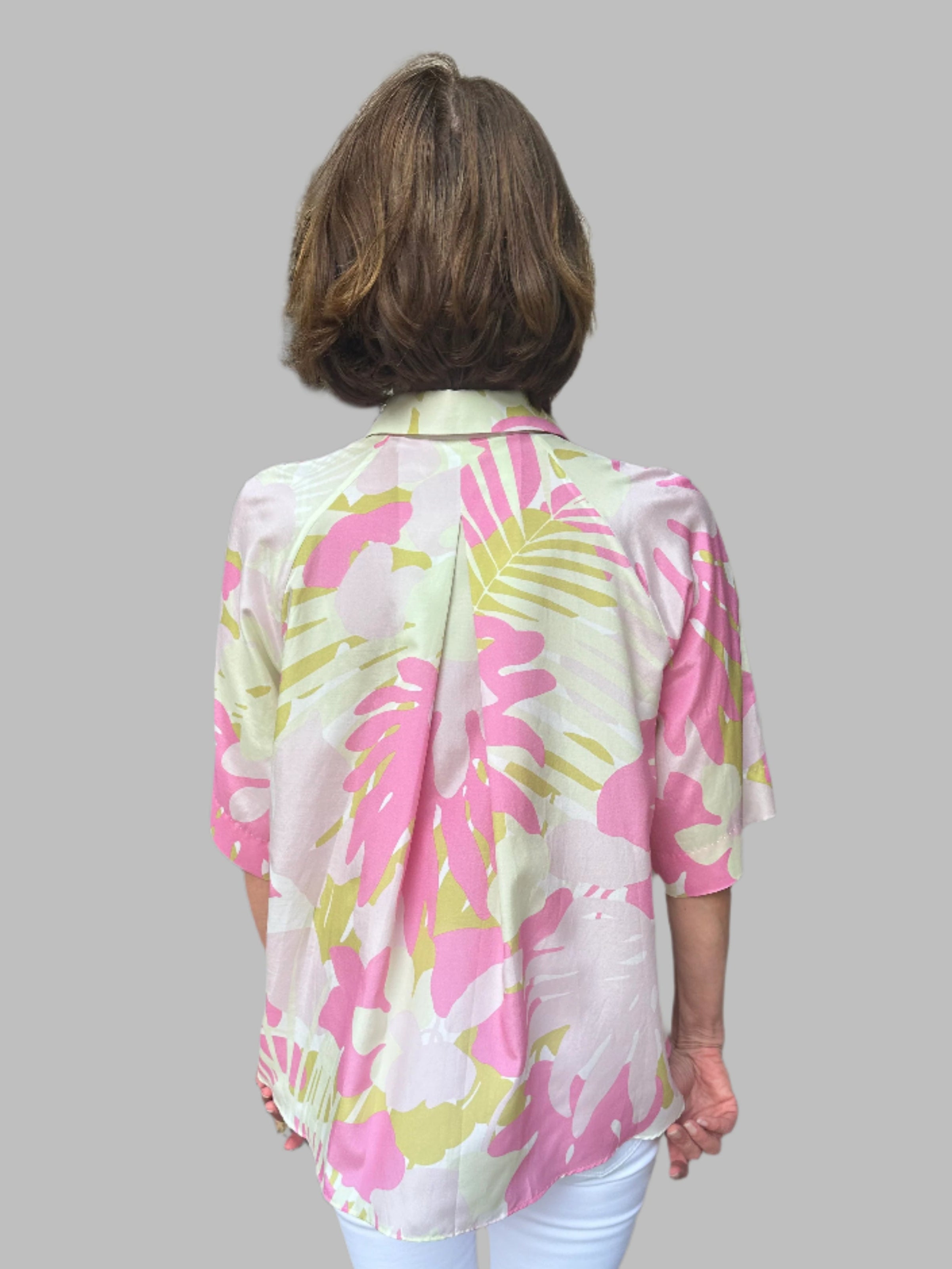 This stylish blouse features a vibrant, tropical-inspired print with a lightweight and breathable fabric blend of silk and cotton. The relaxed silhouette and short sleeves make it a perfect choice for casual yet chic occasions.