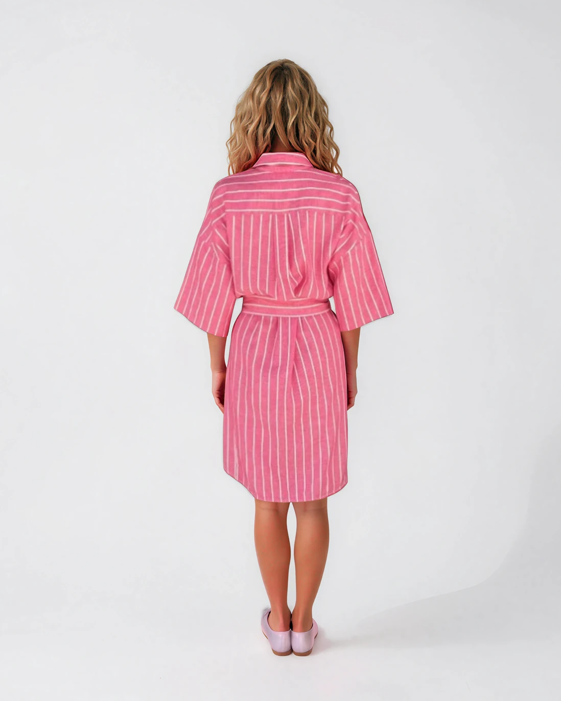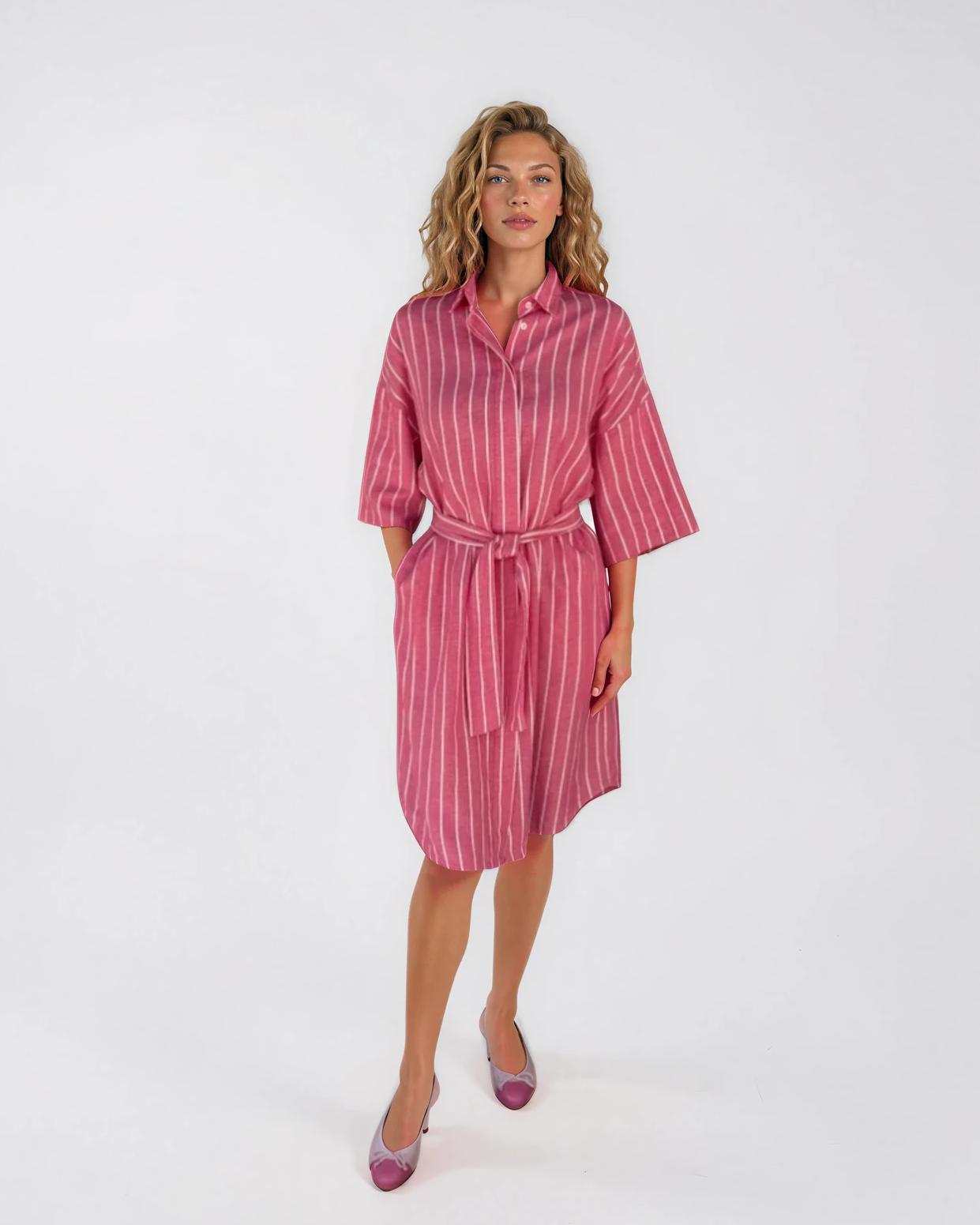 Effortlessly chic and timeless, this Italian linen shirt dress is the perfect piece for warm-weather dressing. Crafted from breathable natural linen, it features a relaxed silhouette with elegant vertical stripes that elongate the figure. The classic shirt collar and soft half sleeves give it a refined yet easygoing look, while the self-tie belt allows you to define the waist or wear it loose for a more relaxed feel. Side pockets add everyday practicality, making this dress as functional as it is stylish.