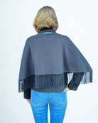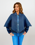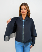 A versatile two-in-one design that transforms with ease. The detachable fringed cape can be worn on its own for a chic statement or layered over the tailored jacket for a striking, two-tiered look. Worn separately, the jacket offers clean lines, front pockets, and luxe detailing—perfect for effortless sophistication in any setting.