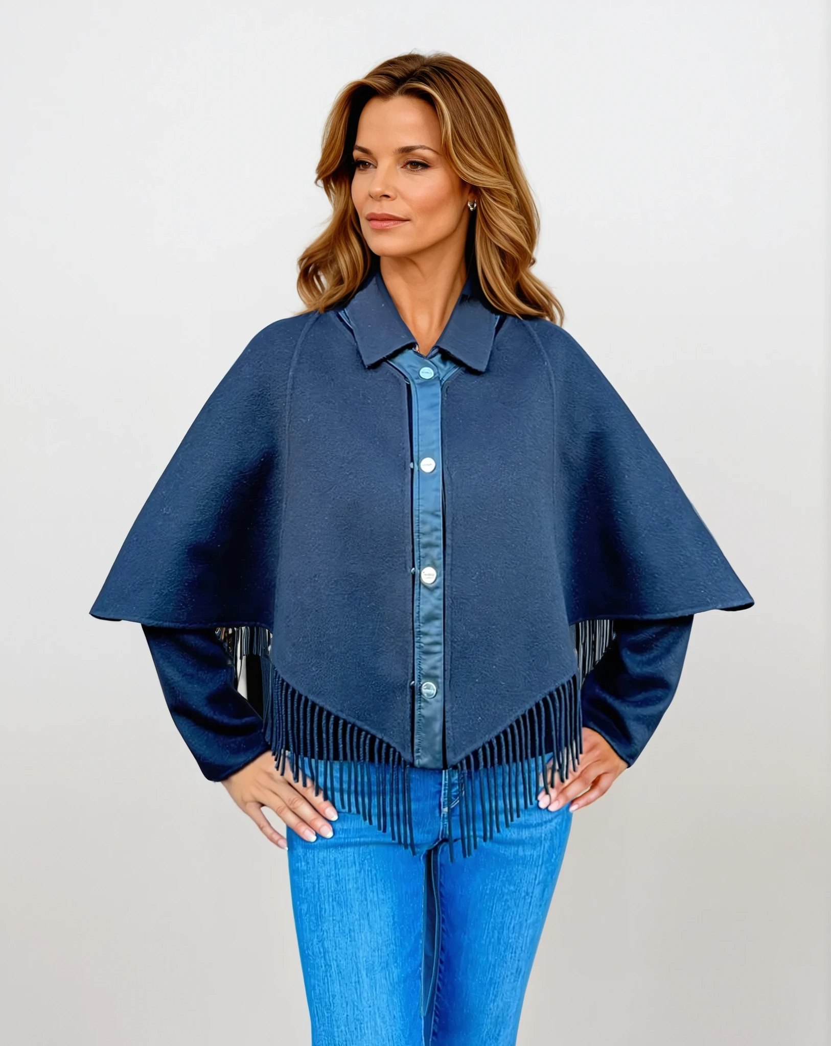 - Two-in-one design: detachable woven cape with fringe