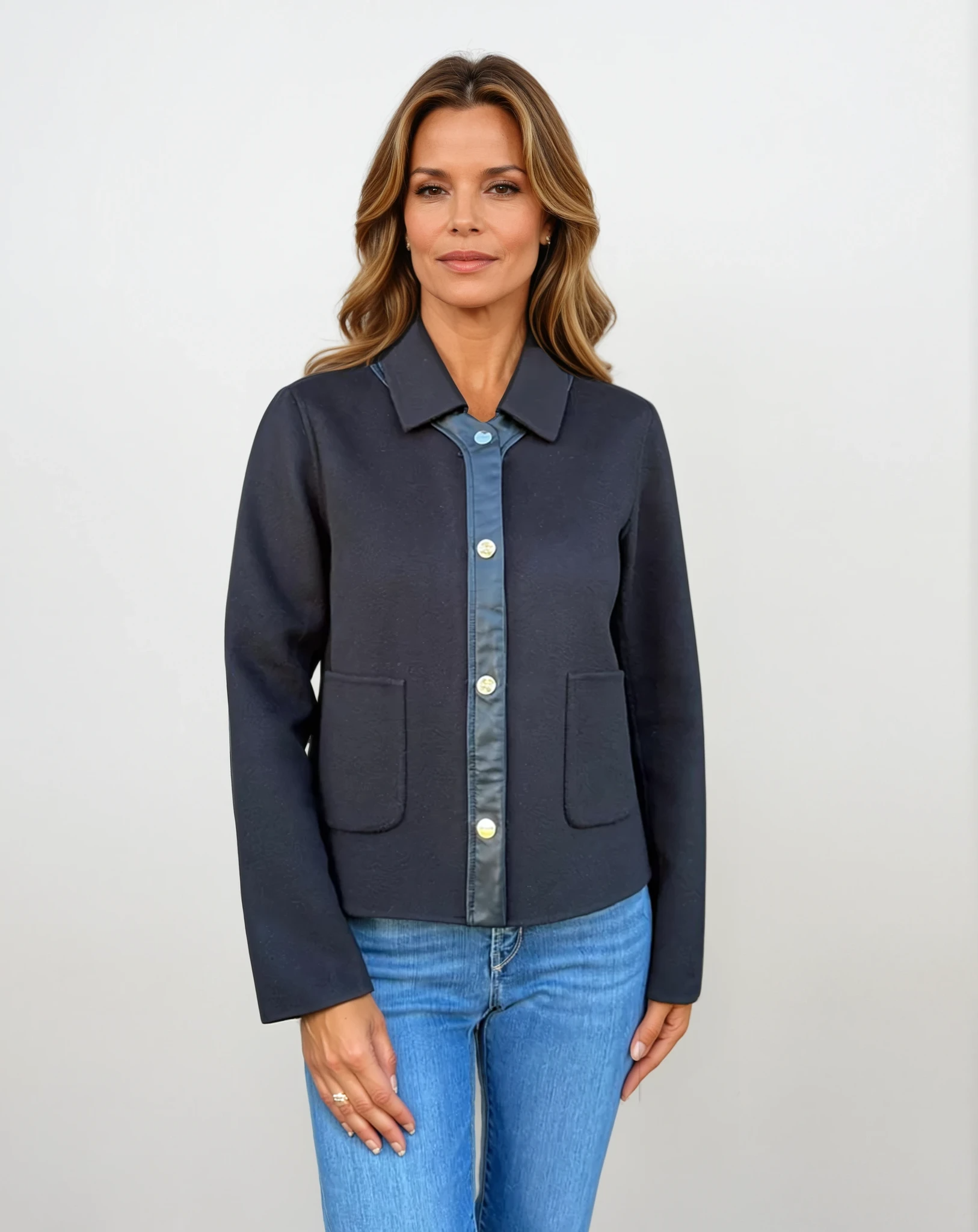 - Tailored jacket with front pockets and real leather trim
