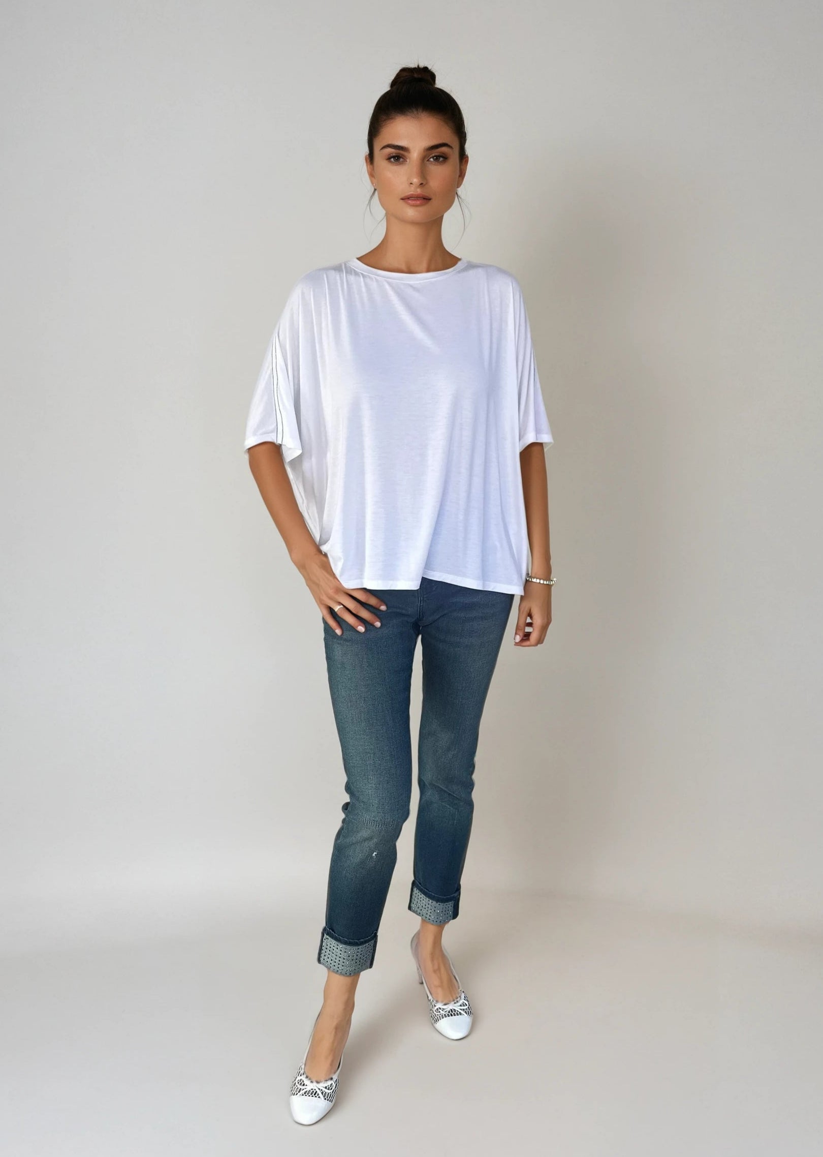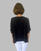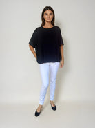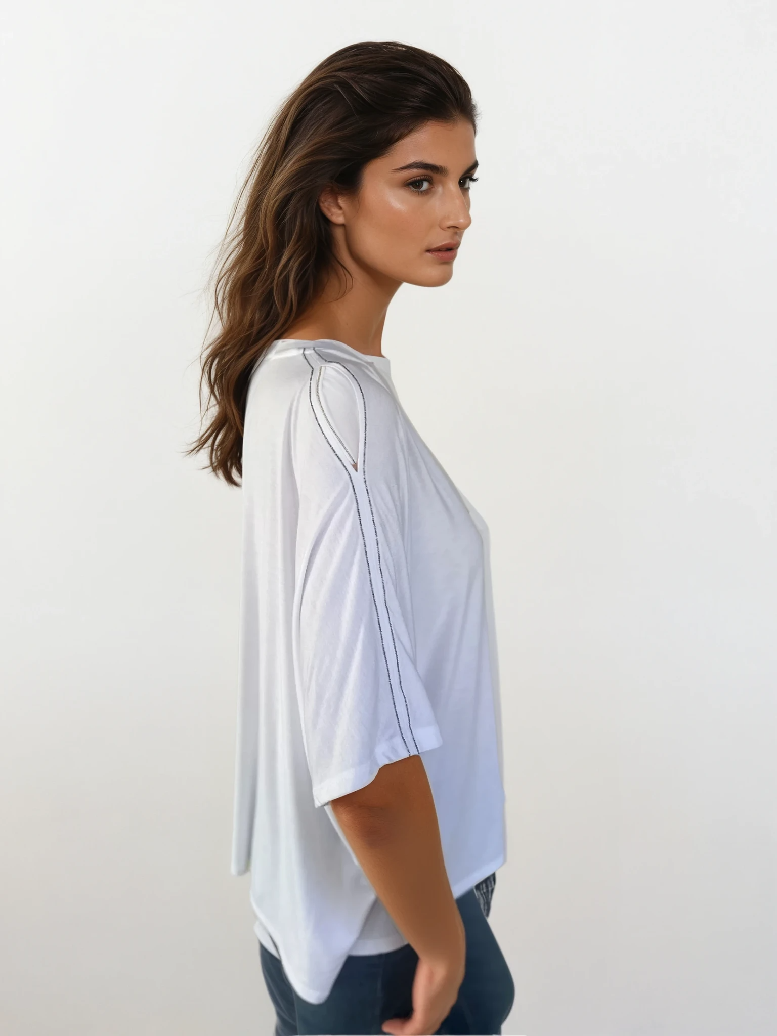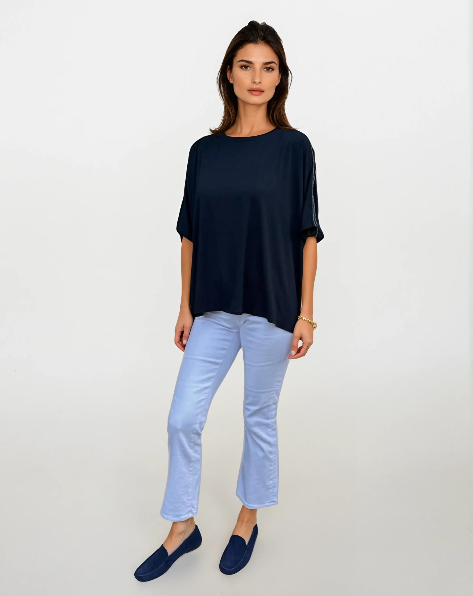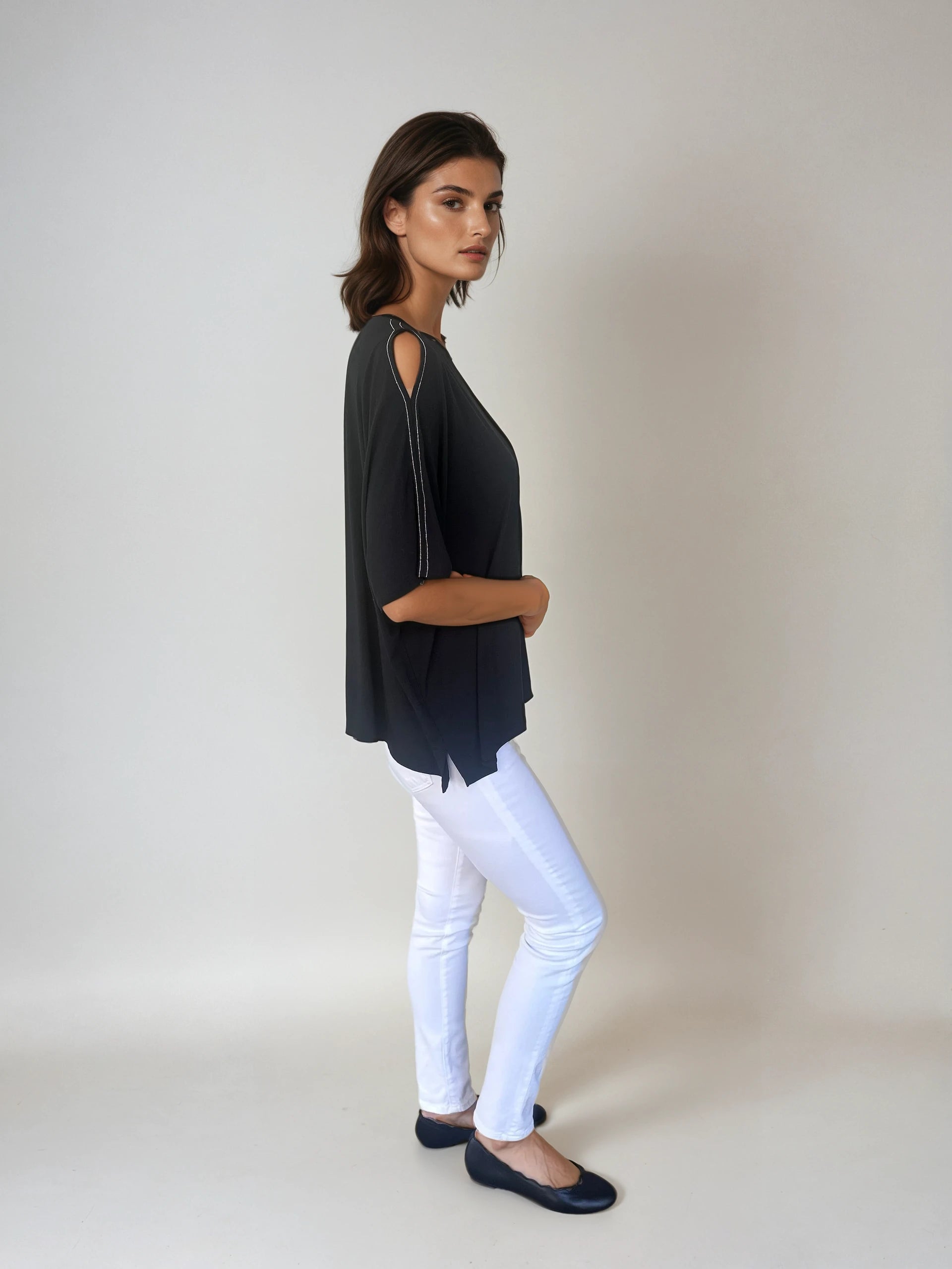 Chic meets comfort in this versatile blouse with elegant shoulder cut-outs and subtle metallic detailing. Available in Black, White, and Navy — effortless style for any occasion.