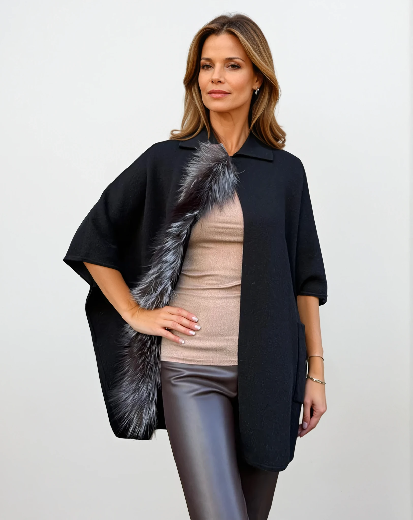 A sophisticated cape-style layer that drapes effortlessly with modern elegance. The open-front design is accented by a lush fox trim, adding a touch of refined luxury. A single snap closure at the collar offers a clean, minimal finish, while the detachable fur detail allows you to style it with or without the trim. Timeless, versatile, and polished—perfect for day-to-night dressing.