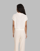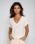 This lightweight knit vest is crafted from 100% cotton for breathable comfort and timeless style. Featuring a flattering V-neckline, subtle chevron detailing, and a relaxed silhouette, it offers an effortless balance of elegance and ease. Perfect for layering or wearing on its own for a chic, everyday look.