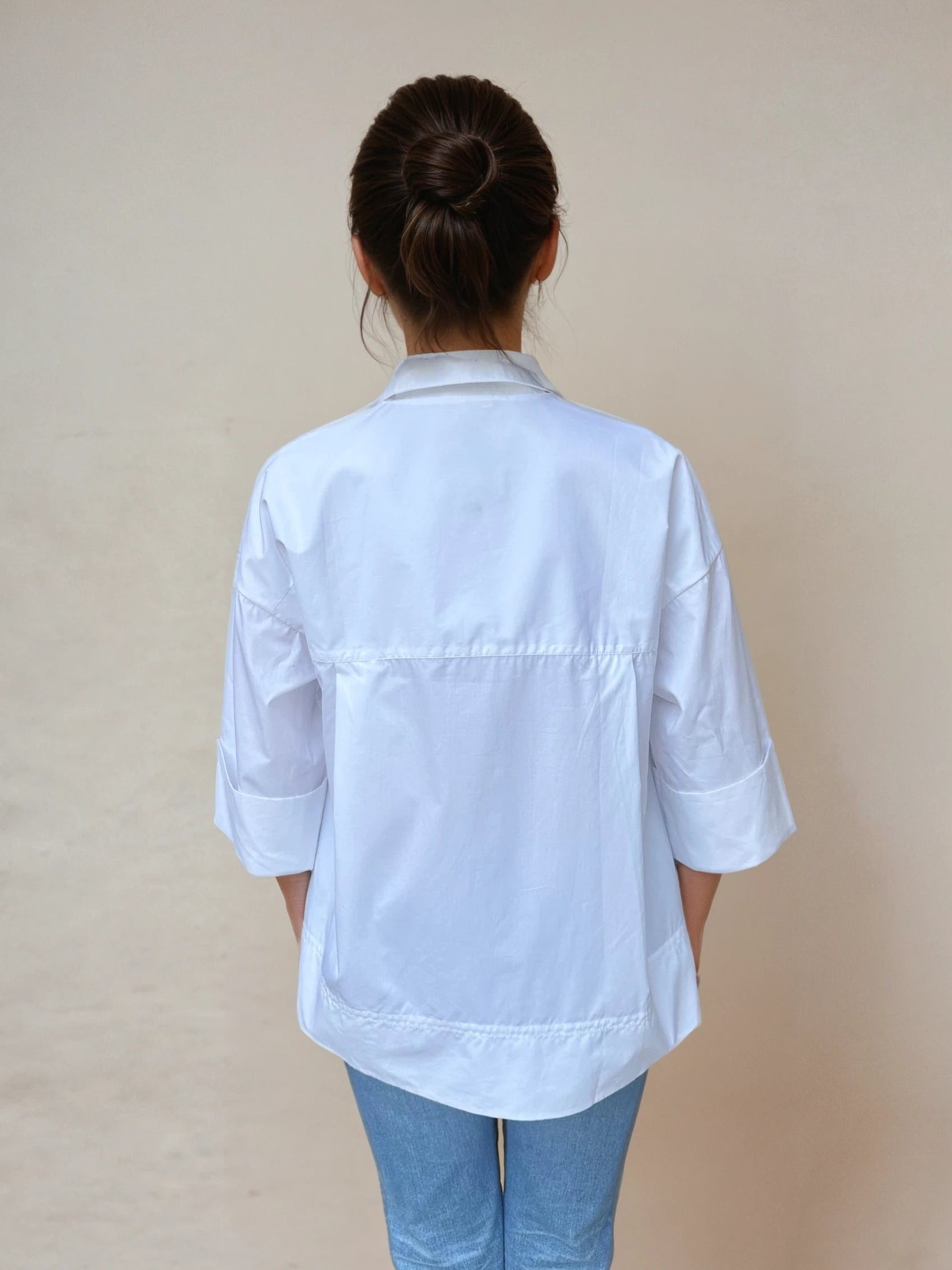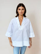 This lightweight blouse offers a relaxed, elegant silhouette with a soft open V-neck and loose 3/4 sleeves — perfect for effortless summer style.