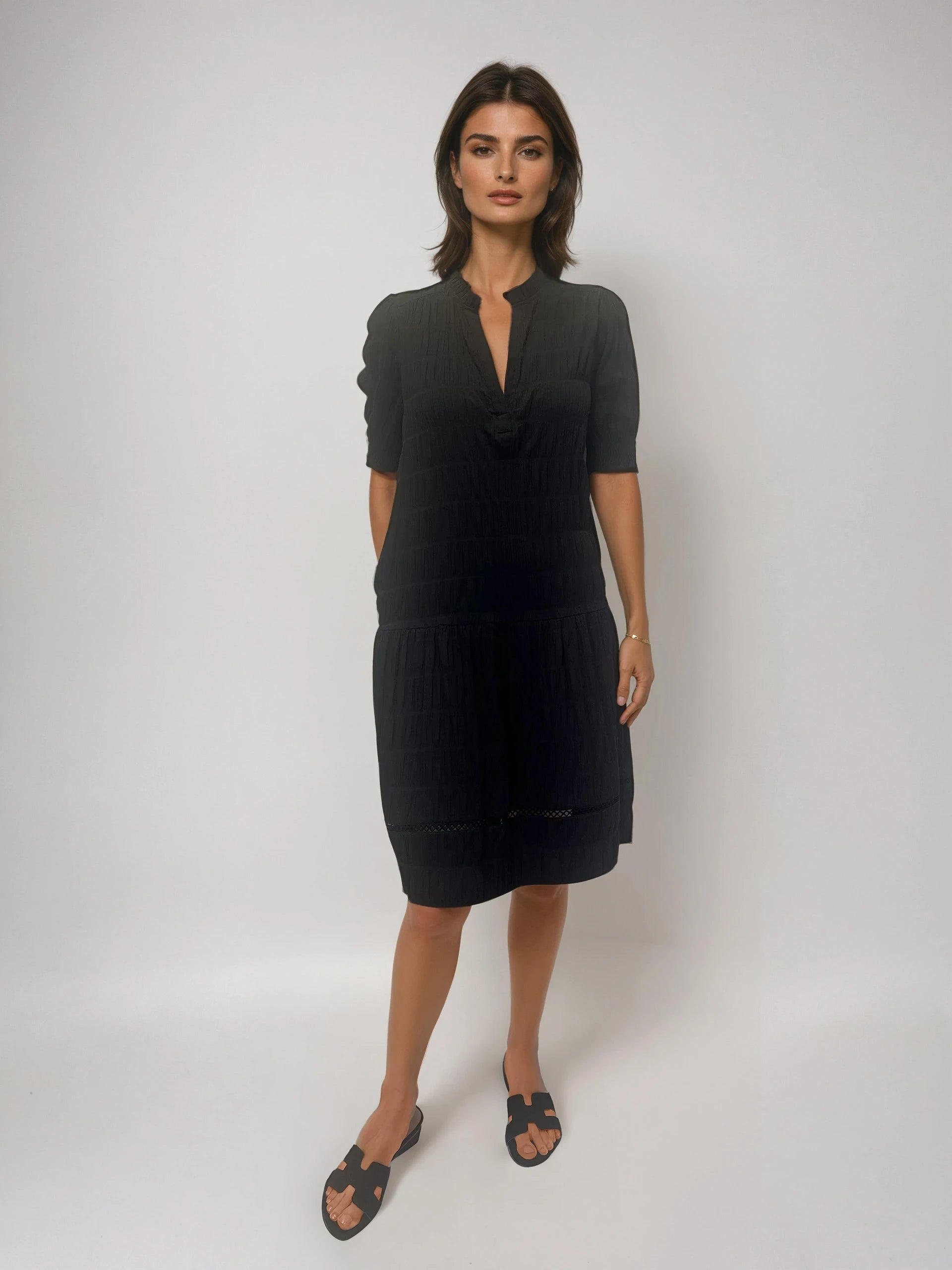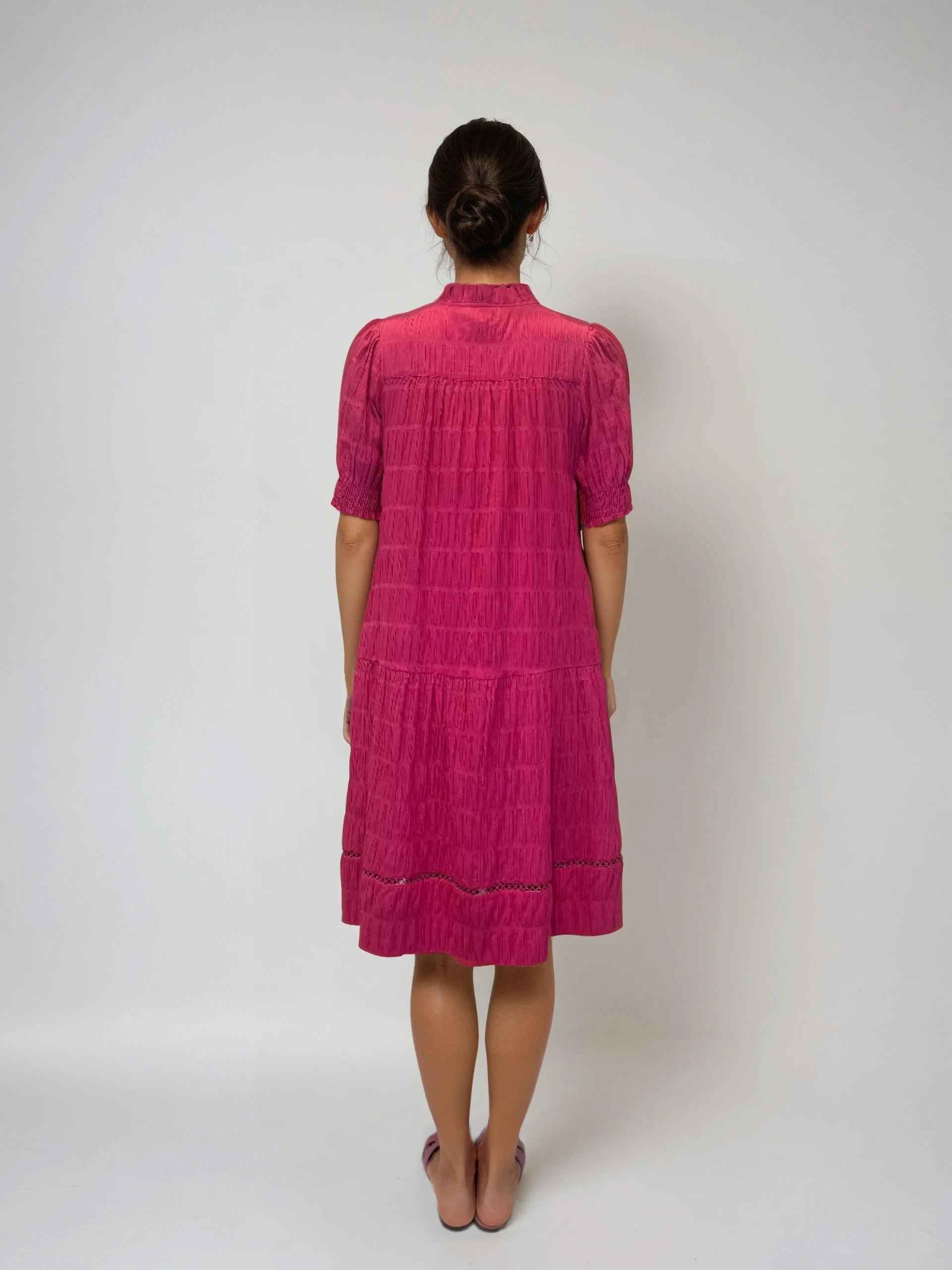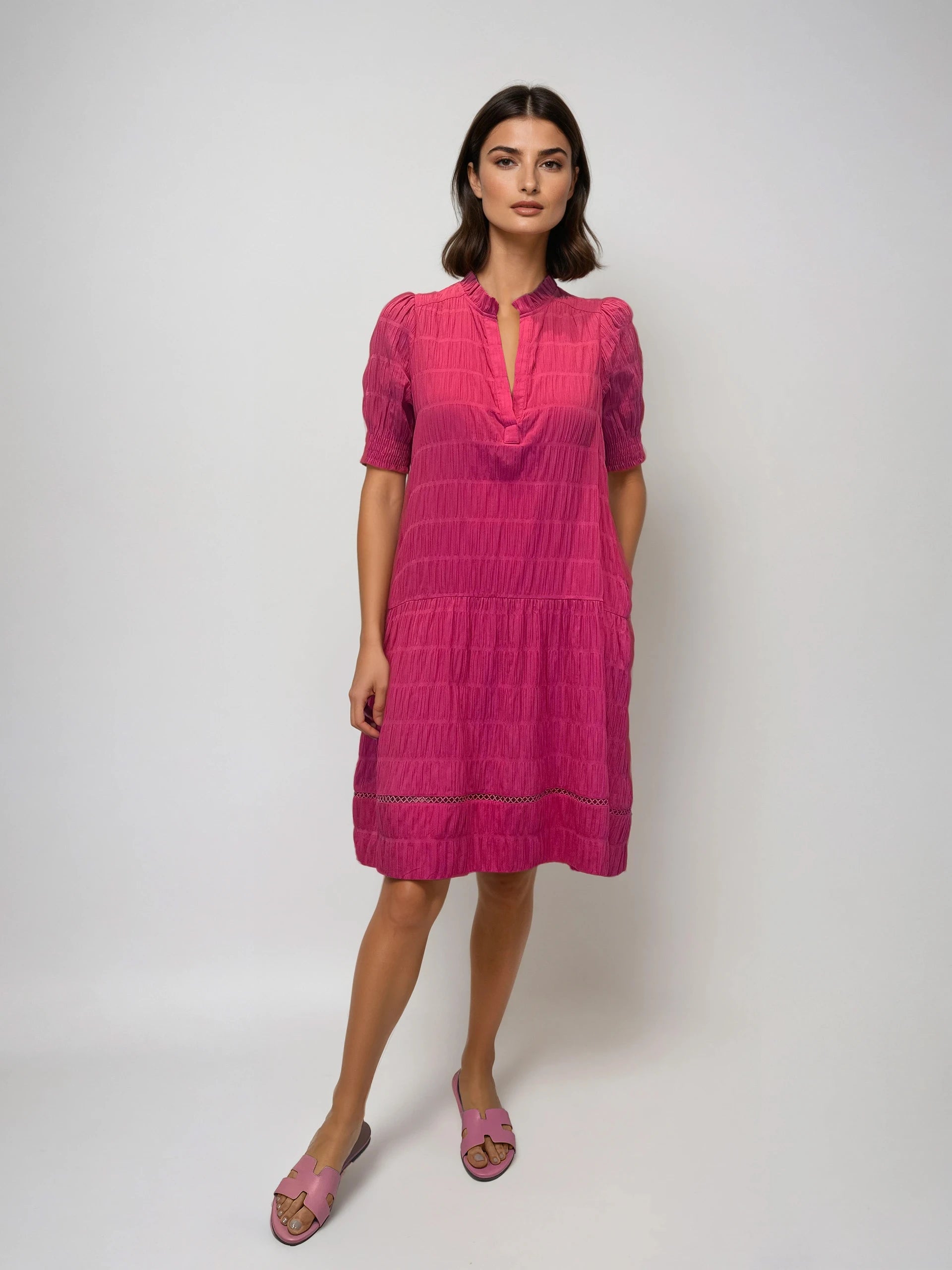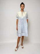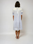 This breezy dress features a softly textured grid pattern, smocked short sleeves, and delicate openwork embroidery at the hem for an airy, feminine finish.
