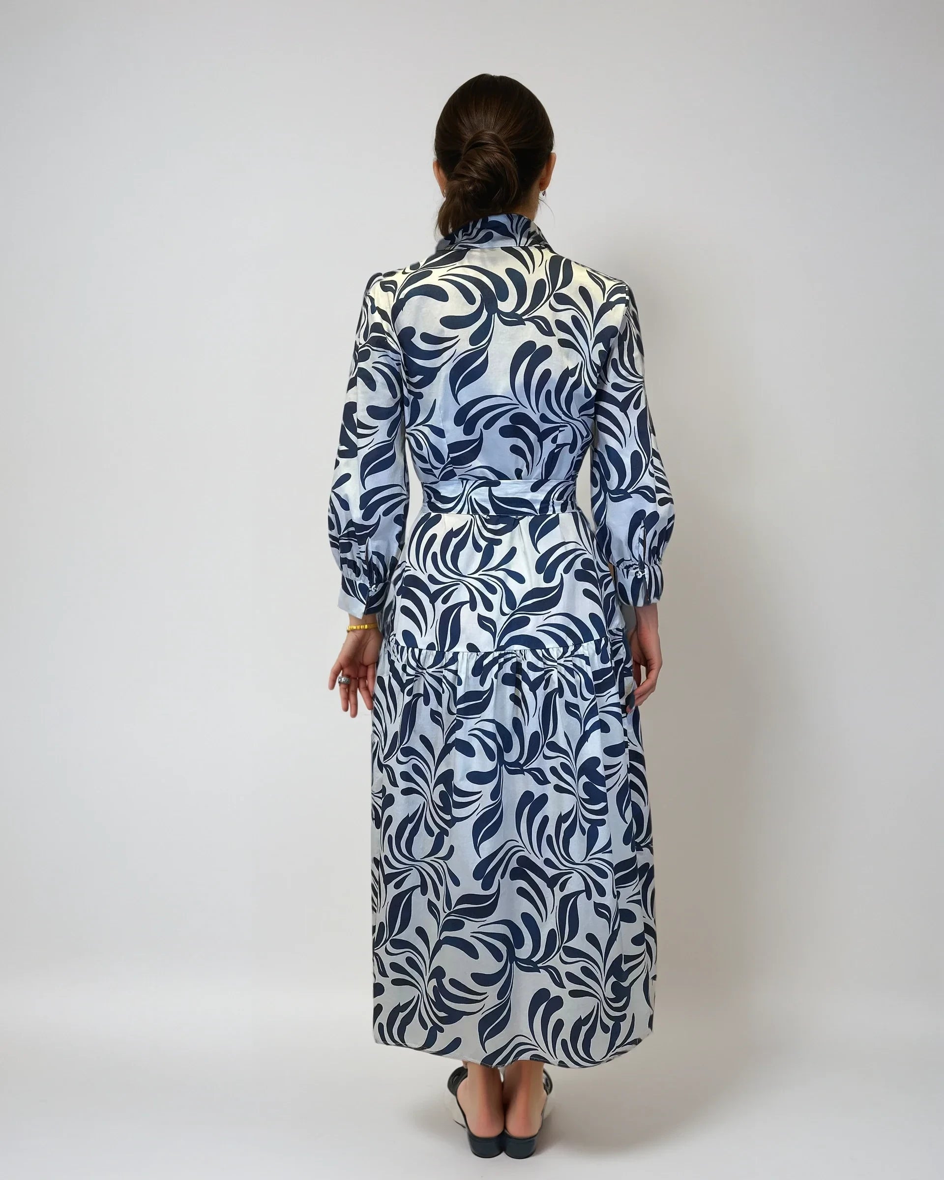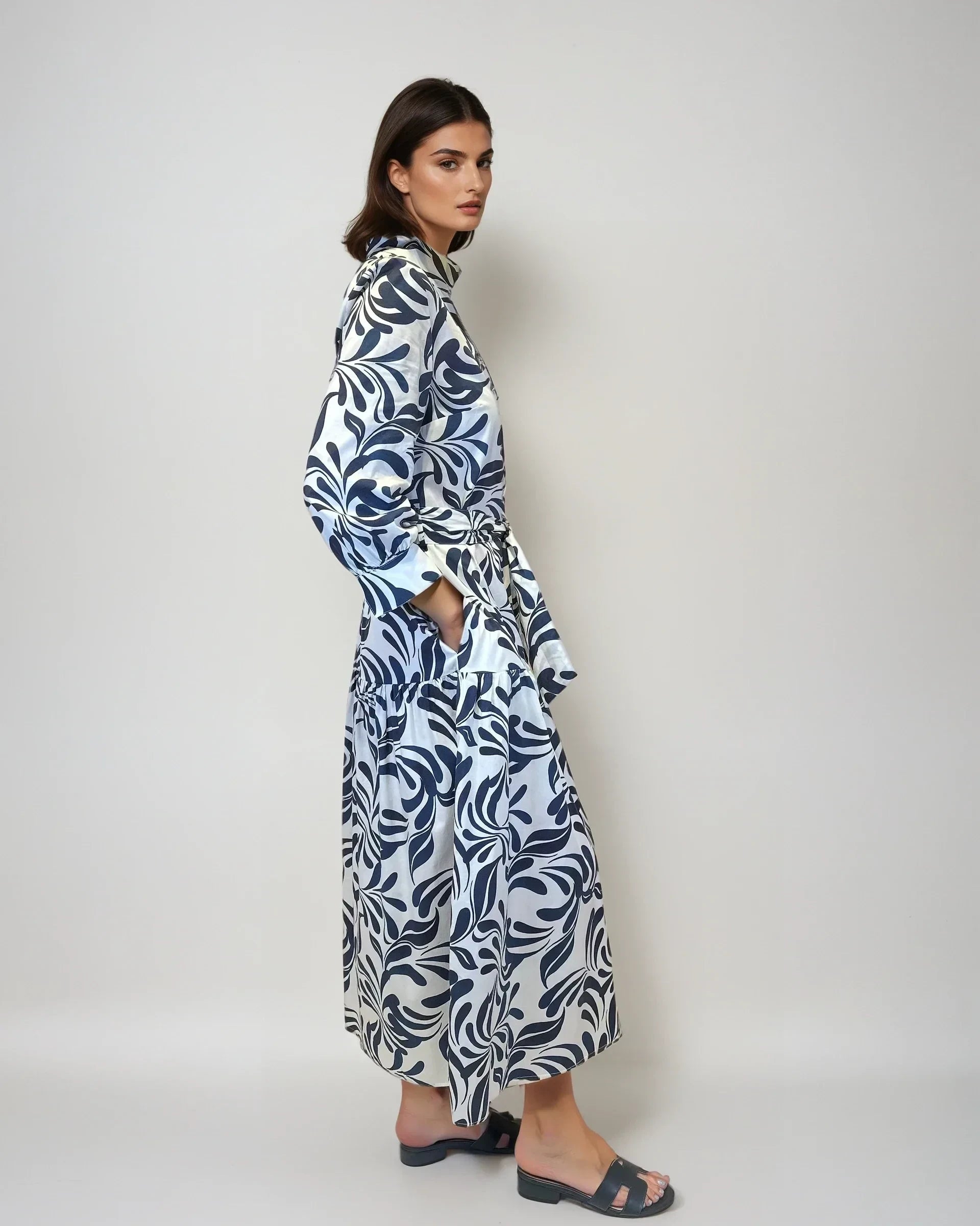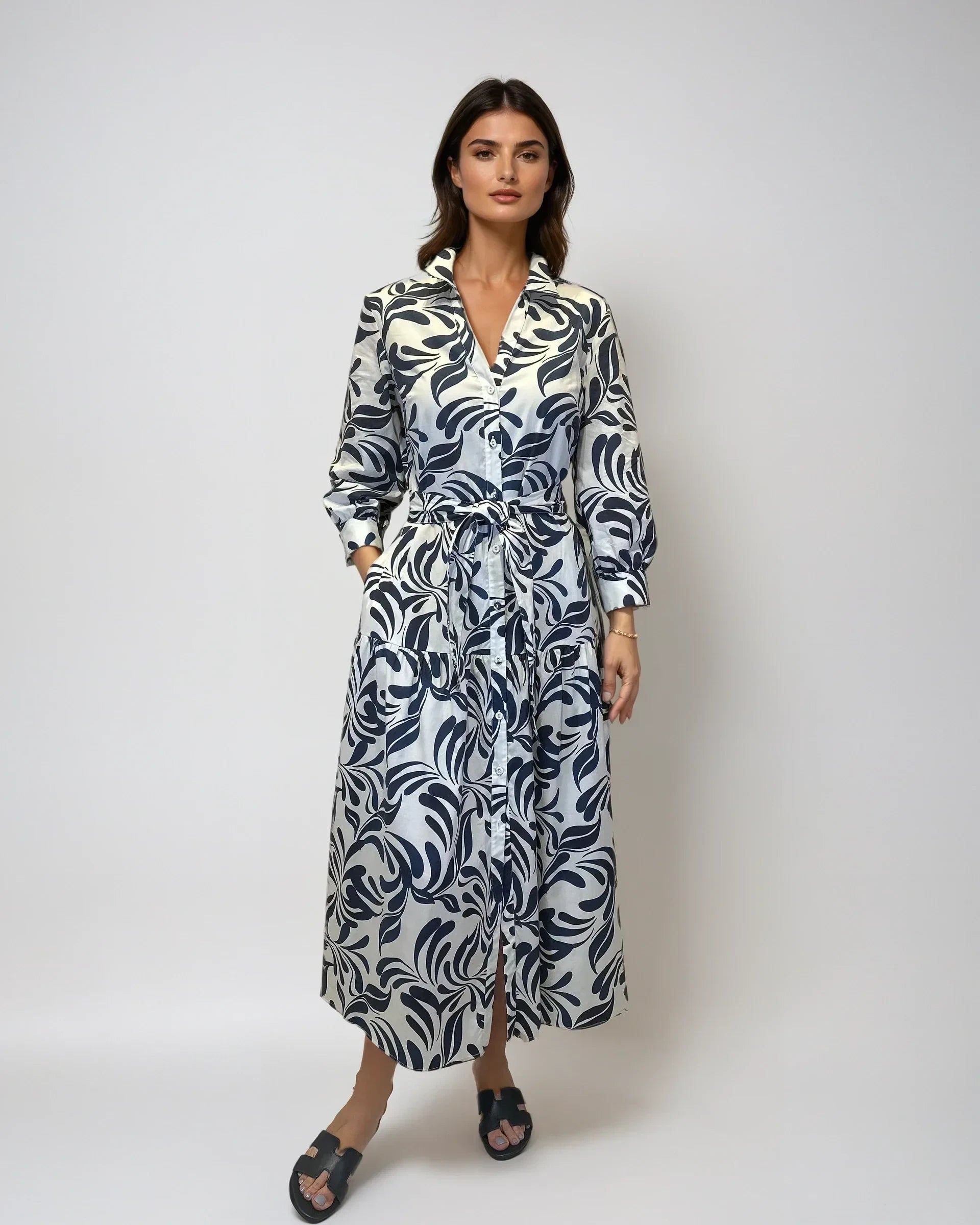 This button-down shirt dress features a bold navy leaf print on crisp white cotton, with a belted waist and 3/4 sleeves for a flattering, polished look.