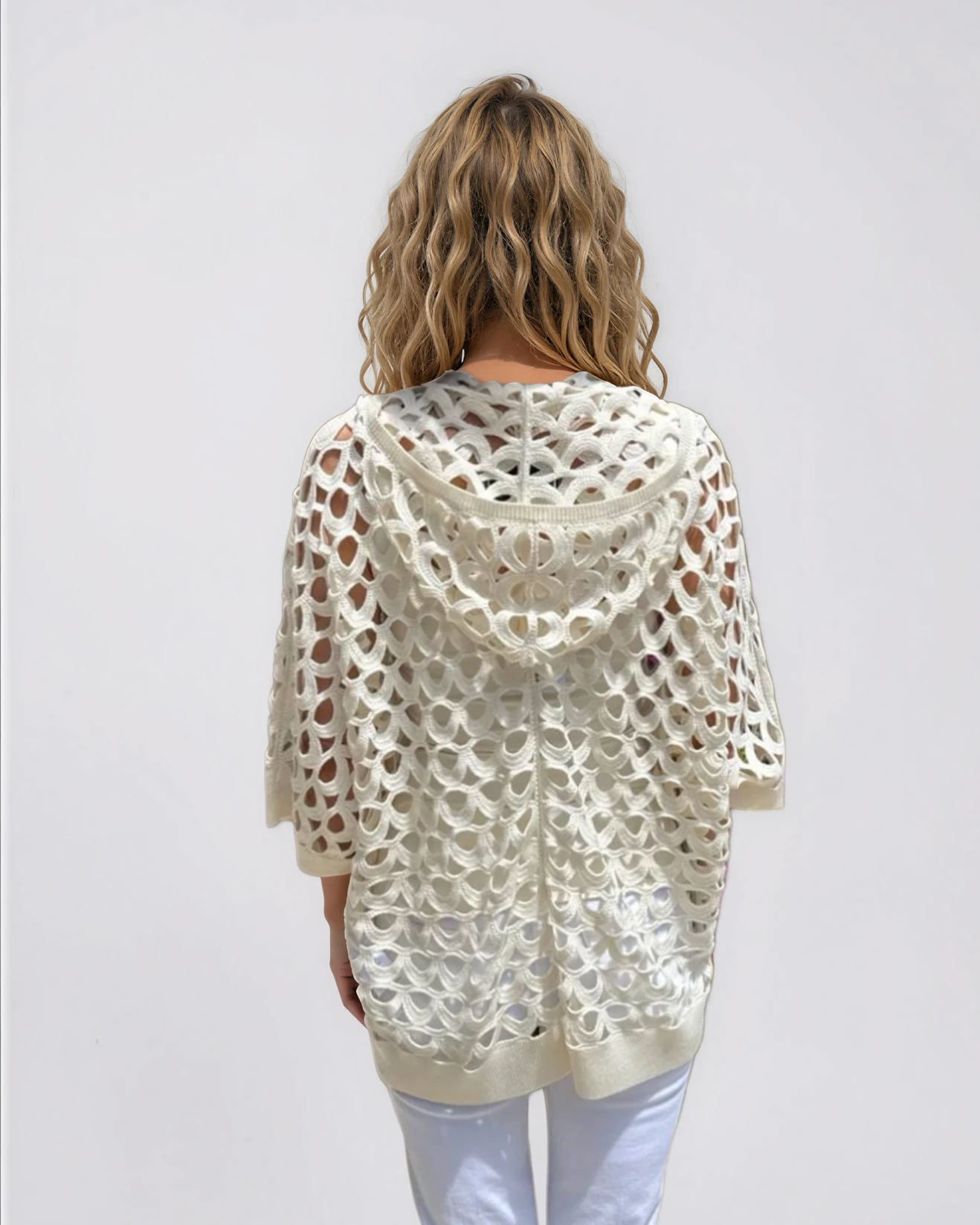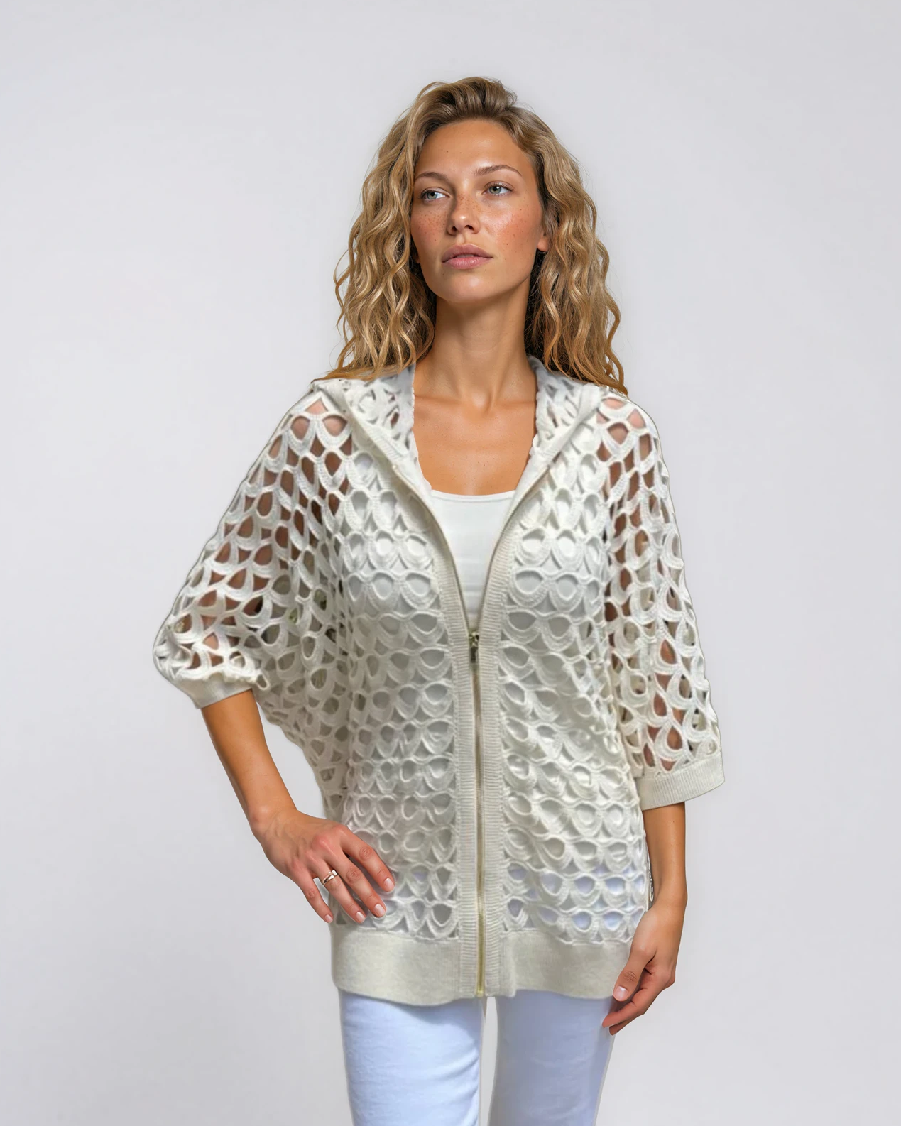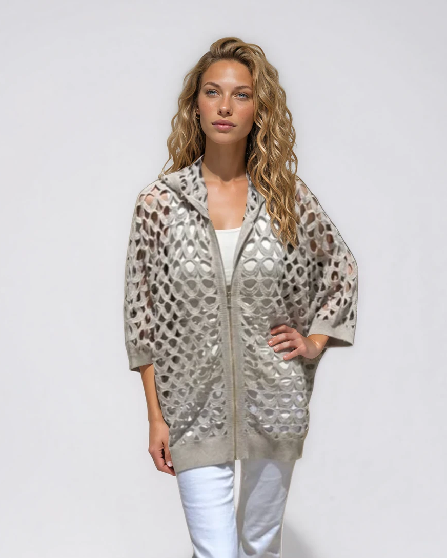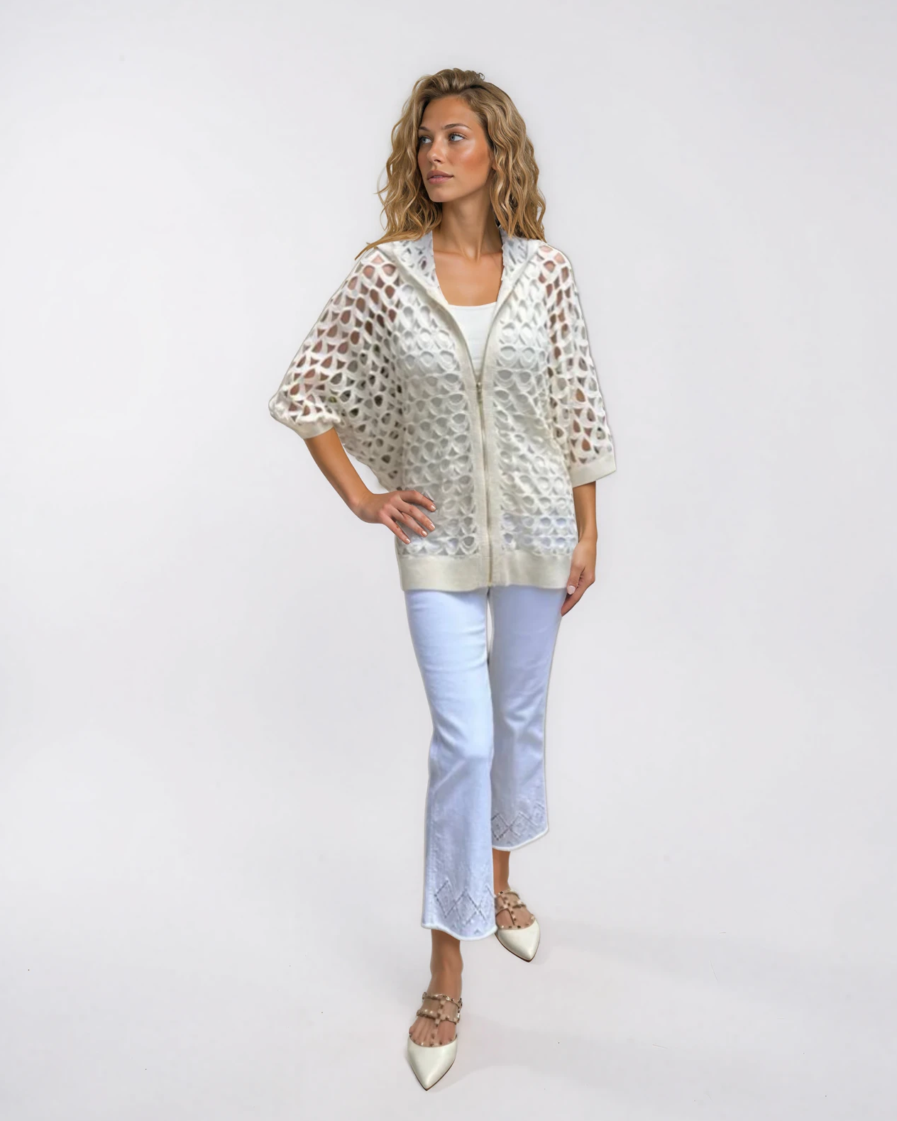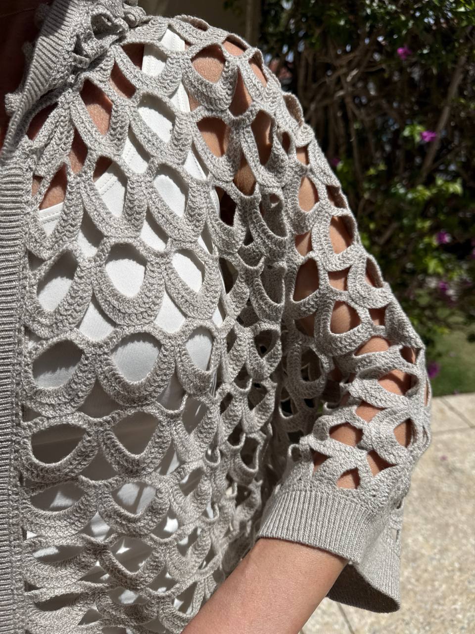 An effortlessly chic oversized cardigan designed to elevate everyday dressing. Crafted in a soft merino wool and cashmere blend, this piece features an intricate open-knit pattern that feels both modern and refined. The relaxed silhouette drapes beautifully, creating movement and lightness while offering just the right amount of coverage.